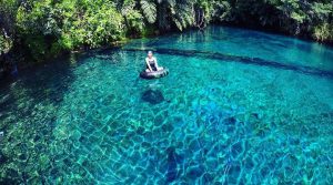Airnya sangat jernih sehingga terlihat dasar danau, dikelilingi hutan tropis yang asri dan tenang.